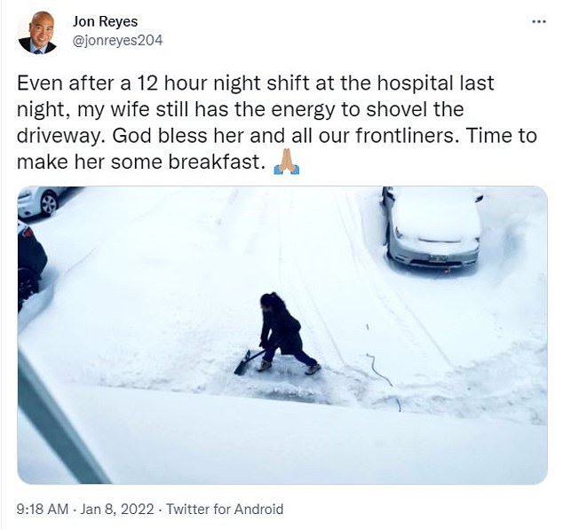 On Saturday Jon Reyes a member of the Legislative Assembly of Manitoba and Manitobas minister of economic development and jobs posted a tweet expressing admiration for his wife Cynthia for shoveling snow after working the night shift at a nearby hospital. 192022 707 AM PT.